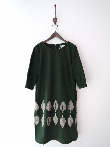 デザイン:ミナペルホネンランドリー「happa」の刺繍ワンピースです。カラーはグリーンベースにベージュの刺繍があしらわれ、やや起毛がかった素材です。バックのフック&ファスナーで着脱し、両腰にはシームポケットがございます。裏地はなく、袖口はゴム入りです。定価48,300円の商品です。(掲載写真は、実商品のカラーにできるだけ近づけるよう努力はしておりますが、お使いのモニターや画面設定等によっては、色が異なって見える場合もございますので、予めご了承下さい)