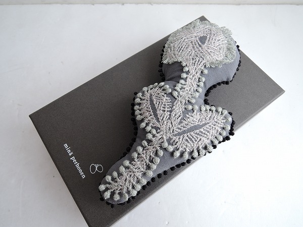 デザイン:mina perhonenのfrost gardenシリーズのお花ブローチです。カラーはグレー地に淡いパステルグリーン・ほんのりピンクがかった薄いベージュの刺繍が施されたデザインで、周りにはブラックのポンポン刺繍で縁取られています。中綿入りのふっくらとしたお品です。