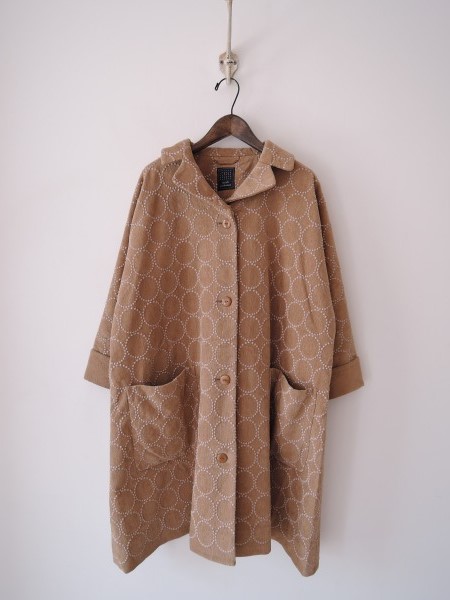 デザイン:mina perhonen 「tambourine」の刺繍コートです。カラーはベージュで、刺繍が施された別珍のような素材であしらわれております。フロントボタン開閉で、両腰&右胸内側にポケットがあり、裏地付きです。袖口は折り返しで、腰ひも付きです。定価120,000円の商品です。 (掲載写真は、実商品のカラーにできるだけ近づけるよう努力はしておりますが、お使いのモニターや画面設定等によっては、色が異なって見える場合もございますので、予めご了承下さい)