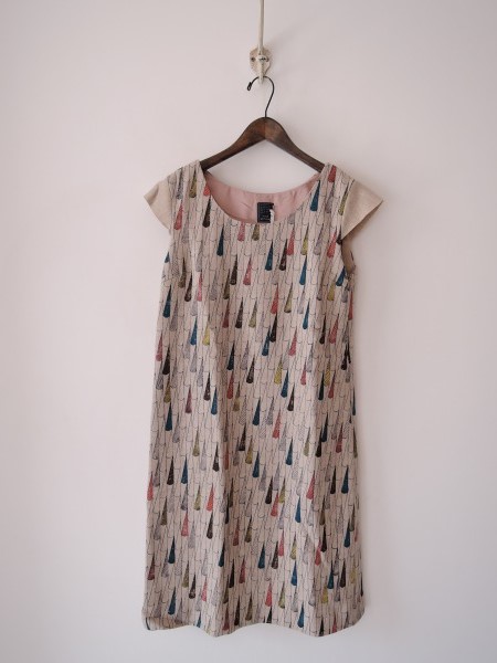 デザイン:mina perhonen 「sunny rain」のワンピースです。カラーはベージュベースにややくすんだようなカラフルなプリント柄で、微起毛素材であしらわれております。袖は裁ち切りのキャップスリーブで、左脇下のファスナーで着脱でき、裏地付きです。定価44,100円の商品です。 (掲載写真は、実商品のカラーにできるだけ近づけるよう努力はしておりますが、お使いのモニターや画面設定等によっては、色が異なって見える場合もございますので、予めご了承下さい)