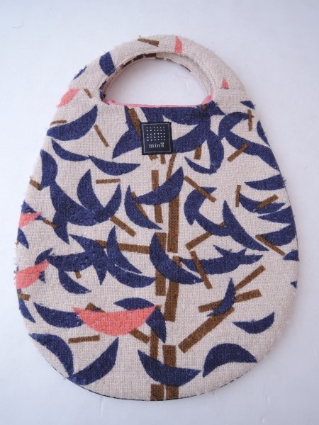 デザイン:minaのbreezeシリーズのエッグバッグです。カラーはライトベージュ地にネイビー・ブラウン・ピンクの総柄で、全体的にピ リング加工が施されたデザインです。パイピングは濃紺の合皮で、内側にはピンクの裏地が付いています。素材は表地が毛 80%、モヘア15%、ナイロン5%、裏地が綿100%です。
