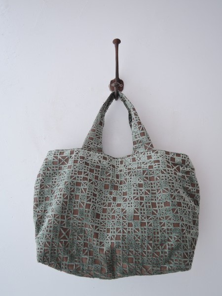 デザイン:mina perhonenのmeriシリーズのパニーニバッグです。カラーはブラウン地にグリーン掛かったグレーのパイル刺繍が全面に施されたデザインで、内側はカーキブラウンの裏地にホワイトの蝶の刺繍があしらわれた被せと、ポケットが2つ付いています。素材は表地が綿50%、麻50%、パイルがアクリル100%です。