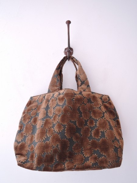 デザイン:mina perhonenのgood news!シリーズのパニーニバッグです。カラーはチャコールグレー地にブラウンのお花のパイル刺繍が全面に施されたデザインで、内側はカーキブラウンの裏地に淡い水色の刺繍があしらわれた被せと、ポケットが2つ付いています。素材は表地が綿50%、麻50%、パイルがアクリル100%です。