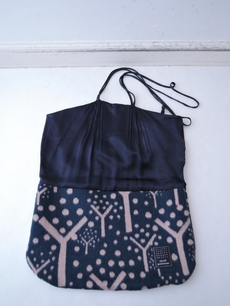 デザイン:mina perhonenのfruttaシリーズのフォンダンバッグです。カラーはややグリーンがかったネイビー×ベージュピンクの総柄で、毛羽のあるフェルト生地と光沢のある濃紺地の切り替えデザインです。開口部は巾着絞りで、素材は毛100%です。