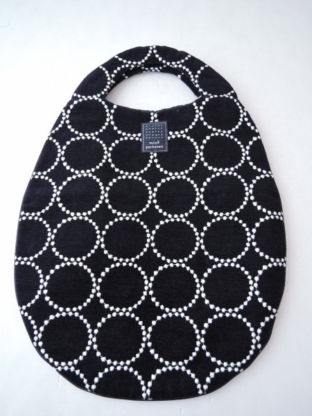 デザイン:mina perhonenのtambourineシリーズのエッグバッグです。カラーはネイビーの毛羽のある素材に、ホワイトで刺繍が全面に施されたデザインで、縁周りに濃紺の合皮のパイピングと、内側には光沢のある濃紺の裏地があしらわれています。素材は表地が綿63%、毛30%、ナイロン7%、刺繍部分が綿100%、裏地がポリエステル100%です。