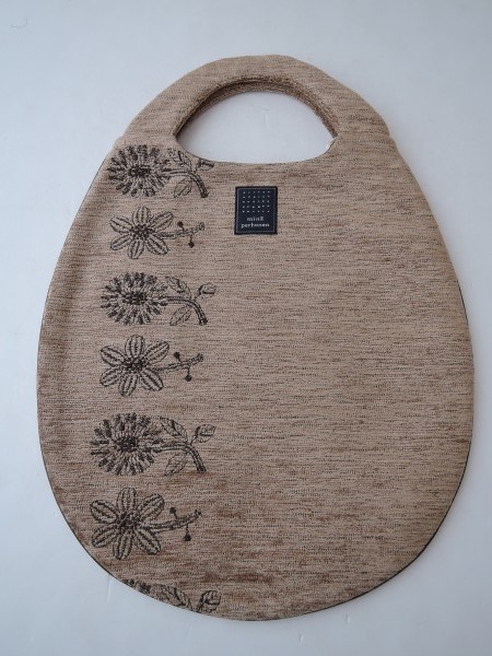 デザイン:mina perhonenのtori to hanaシリーズのエッグバッグです。カラーはブラウンのパイル地で、フロントにダークブラウンでお花の刺繍と、裏側に小鳥の刺繍が施されたデザインです。パイピング部分はブラウンの合皮で、内側には光沢のあるブラウンの裏地が付いており、素材は表地がアクリル46%・綿32%・毛14%・ポリエステル8%、レース部分が綿100%、裏地がポリエステル100%です。