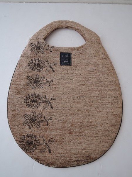 デザイン:mina perhonenのtori to hanaシリーズのエッグバッグです。カラーはライトブラウンのパイル地で、フロントにダークブラウンでお花の刺繍と、裏側に小鳥の刺繍が施されたデザインです。パイピング部分はブラウンの合皮で、内側には光沢のあるブラウンの裏地が付いており、素材は表地がアクリル46%・綿32%・毛14%・ポリエステル8%、レース部分が綿100%、裏地がポリエステル100%です。