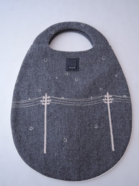 デザイン:minaのyuki no hiシリーズのエッグバッグです。カラーはミックスグレー地に、ライトベージュで刺繍が施されたデザインで、パイピングはオフホワイトの合皮です。内側には光沢のあるホワイトの裏地が付いており、素材は表地が毛36%、綿24%、アンゴラ20%、キュプラ20%、裏地がポリエステル100%です。