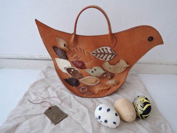 デザイン:mina perhonenのtori bag とりバッグです。カラーはライトブラウンのレザーで、フロントにベージュやブラウン系のリーフモチーフがあしらわれたデザインです。3種類のテキスタイルが使用された3つの卵が付いています。