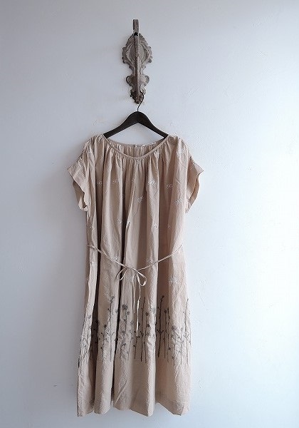 デザイン:mina perhonen「summer garden」のワンピースです。カラーはベージュで、ホワイトやグレー系の刺繍が施された薄手生地で、背上部のループボタンで着脱できます。共布ベルトひも付きです。 (掲載写真は、実商品のカラーにできるだけ近づけるよう努力はしておりますが、お使いのモニターや画面設定等によっては、色が異なって見える場合もございますので、予めご了承下さい)