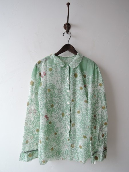 デザイン:mina perhonen 「papillon」の綿シフォンシャツです。カラーはミントグリーン×白×オーカー×レッドで、透け感&シボシワのあるシフォンジョーゼット地です。フロントはボタン開きで、袖口は光沢のあるグログランテープ&フリルがあしらわれ、衿、前立て、袖、裾のヘムは千鳥かがり始末です。ポケットはございません。定価は31,500円の商品です。 (掲載写真は、実商品のカラーにできるだけ近づけるよう努力はしておりますが、お使いのモニターや画面設定等によっては、色が異なって見える場合もございますので、予めご了承下さい)