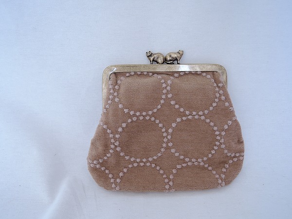 デザイン:mina perhonenのtambourineシリーズのカドルパースです。カラーはベージュの毛羽のあるベースに刺繍が施されたデザインで、開口部は猫のモチーフがあしらわれたがま口仕様です。内側はグリーングレーのレザーであしらわれており、ライトブラウンのがま口ポケットが1つと、カード収納ポケットが1つ付いています。