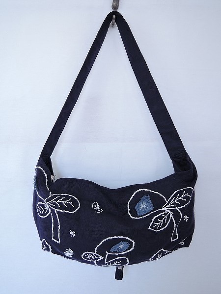 デザイン:2015年SSコレクション mina perhonen bowシリーズのボディバッグ小です。カラーはネイビーで、ブルーネイビーの毛糸で編まれたお花やホワイトの刺繍が施されており、持ち手は2way仕様のデザインです。開閉はファスナーで、内側は水色の裏地にポケットが1つあしらわれており、素材は表地が麻85%、綿15%、刺繍部分と裏地が綿100%です。