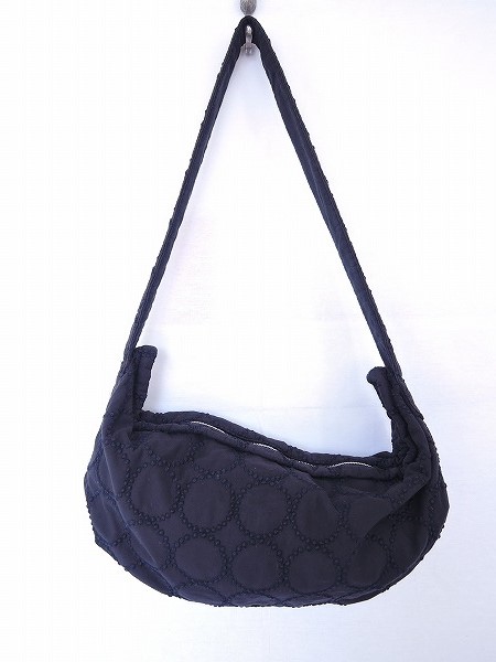デザイン:mina perhonenのtambourineシリーズのボディバッグ小です。カラーはブラック地に濃紺で刺繍が施されたデザインで、開口部はファスナーです。内側には濃紺の裏地とポケットが1つ付いており、素材は表生地・刺繍部分・裏生地共に綿100%です。