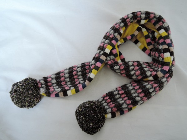デザイン:mina perhonenのニットマフラーです。カラーはブラウン系・ピンク・ホワイト・ライトグレー・ベージュ・くすみがかったブルーなどで、表面は柄編みのニット素材×サイドはマルチボーダー編み、裏面はイエロー無地のニット素材であしらわれております。サイドはポンポンのデザインです。