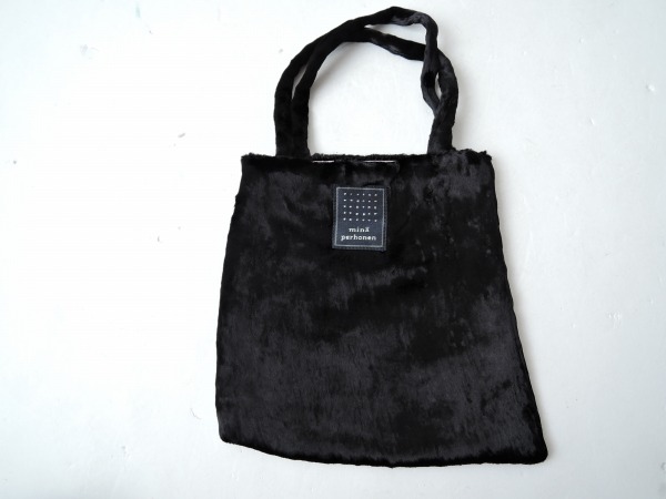 デザイン:mina perhonen 「nekoyanagi」のミニバッグです。カラーはブラックで、柔らかな手触りの光沢のあるパイル素材であしらわれております。内側はライトピンクの別地に切り替えられており、素材は表地のベースがポリエステル100%、パイルがレーヨン100%、裏地がポリエステル100%です。