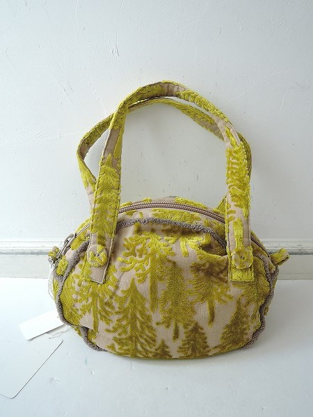 デザイン:mina perhonenのmetsaシリーズのクラウドバッグ小です。カラーはベージュ地に光沢のあるライムグリーンのパイル刺繍が施されたデザインで、縁周りに毛足の長いグレーのパイピングがあしらわれています。ファスナー開閉で、内側はライトブラウンの裏地にポケットが2つ付いており、素材は表生地がベースが麻100%・パイルがアクリル100%、裏生地が綿100%です。本体価格は21,000円です。