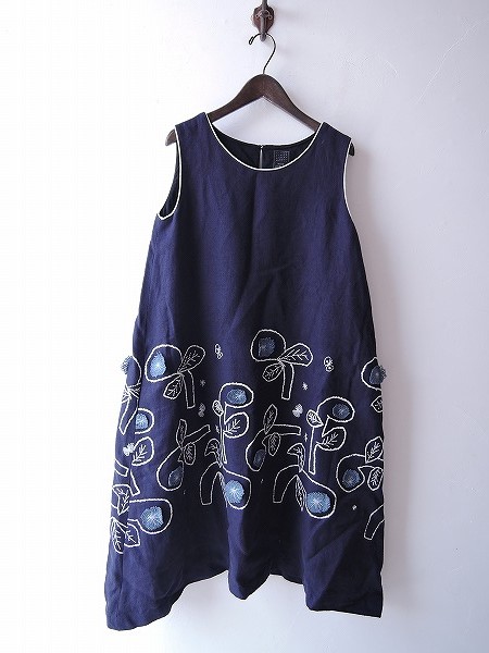 デザイン:2015年SSコレクション mina perhonen「bow」のワンピースです。カラーはネイビーで、ホワイトの刺繍、グレーブルーのモチーフが施されています。背上部のループボタンで着脱でき、両腰ポケット&裏地付きです。 (掲載写真は、実商品のカラーにできるだけ近づけるよう努力はしておりますが、お使いのモニターや画面設定等によっては、色が異なって見える場合もございますので、予めご了承下さい)