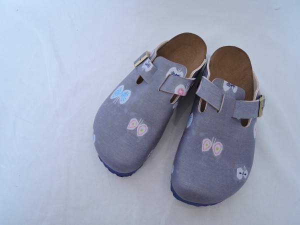 デザイン:mina perhonen×BIRKENSTOCK Papillioのサンダルです。カラーはグレー地にピンク・イエロー・濃い水色・ネイビー等の手書き風の蝶々柄『hana hane』で、甲にベルトがあしらわれたデザインです。