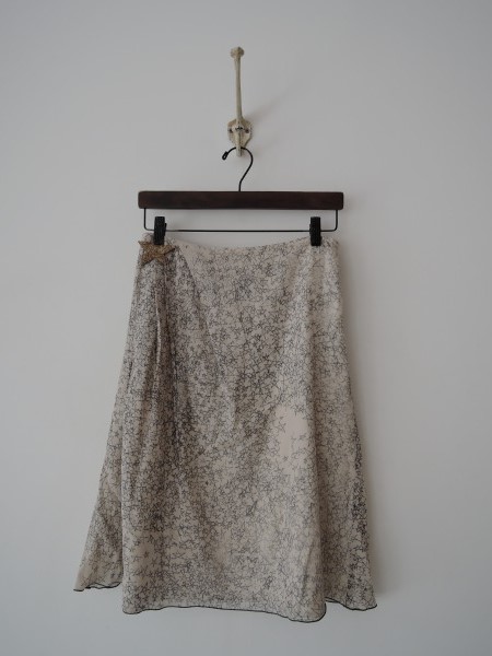 デザイン:mina perhonen 「galileo」のスカートです。カラーはライトグレーベージュ地にグレーの星柄、やや透け感のある薄手生地で、ウエスト左サイドのジッパーです。前右腰にゴールドの星&タックが施され、ポケットはなく、裏地付きです。 (掲載写真は、実商品のカラーにできるだけ近づけるよう努力はしておりますが、お使いのモニターや画面設定等によっては、色が異なって見える場合もございますので、予めご了承下さい)