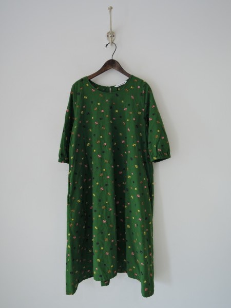 デザイン:mina perhonen 「komado」の刺繍ワンピースです。カラーはグリーン地に、ピンク・紫・黄・ライトブラウンなどの刺繍があしらわれています。後ろネックのループボタン1つ留めで、両腰サイドにはポケットがあり、袖口にはゴムが通っております。裏地は付いておりません。 (掲載写真は、実商品のカラーにできるだけ近づけるよう努力はしておりますが、お使いのモニターや画面設定等によっては、色が異なって見える場合もございますので、予めご了承下さい)
