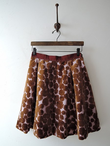 デザイン:mina perhonen 「good news!」のスカートです。カラーはライトパープルベースにブラウンのパイル刺繍が施され、ウエストはあずき色の別布素材です。左ウエストのフック&ファスナーで着脱でき、裏地付きです。定価54,600円の商品です。 (掲載写真は、実商品のカラーにできるだけ近づけるよう努力はしておりますが、お使いのモニターや画面設定等によっては、色が異なって見える場合もございますので、予めご了承下さい)