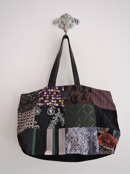 デザイン:mina perhonenのpiece bag ピースバッグです。『count』・『sometimes lucky』・『tambourine』等の様々なテキスタイルが使用された贅沢なお品で、持ち手はブラックのレザーです。開口部にはピンクの蝶々刺繍が施されたダークブラウンの被せが付いており、内側にはポケットが2つございます。