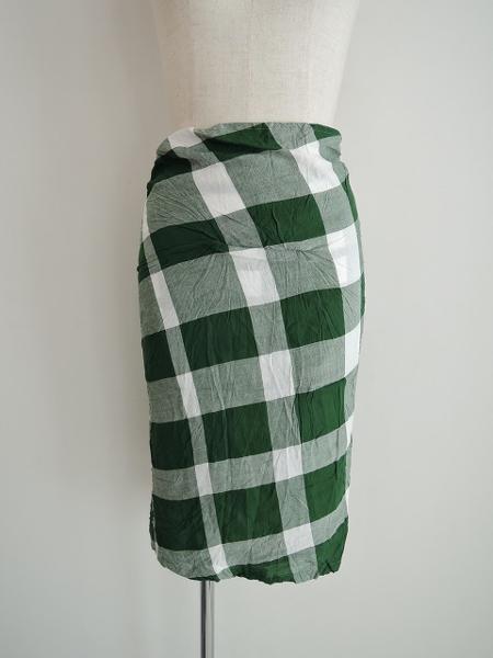 デザイン:mina perhonen 「hills」のチェックスカートです。カラーはホワイト×グリーンで、チェック織の薄手生地であしらわれております。左腰のフック&ファスナーで着脱でき、別布がフロント中央に縫い付けられておりけられており結んで着用する様になっております。裏地付きです。 (掲載写真は、実商品のカラーにできるだけ近づけるよう努力はしておりますが、お使いのモニターや画面設定等によっては、色が異なって見える場合もございますので、予めご了承下さい)