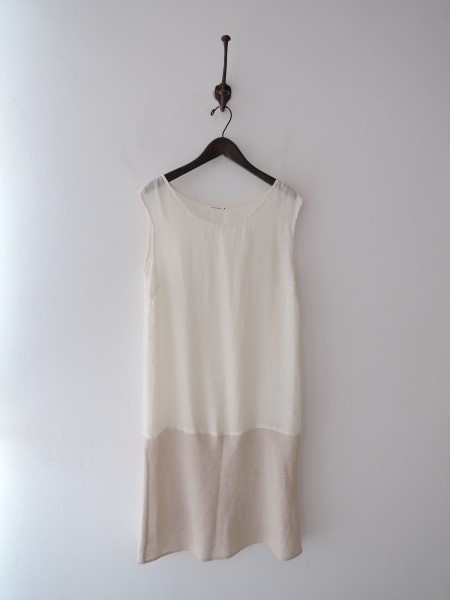 デザイン:mina perhonen「lambent」のインナーワンピースです。カラーはアイボリー×ライトベージュで、透け感のある薄手素材&ニット素材の切り替えデザインです。 (掲載写真は、実商品のカラーにできるだけ近づけるよう努力はしておりますが、お使いのモニターや画面設定等によっては、色が異なって見える場合もございますので、予めご了承下さい)