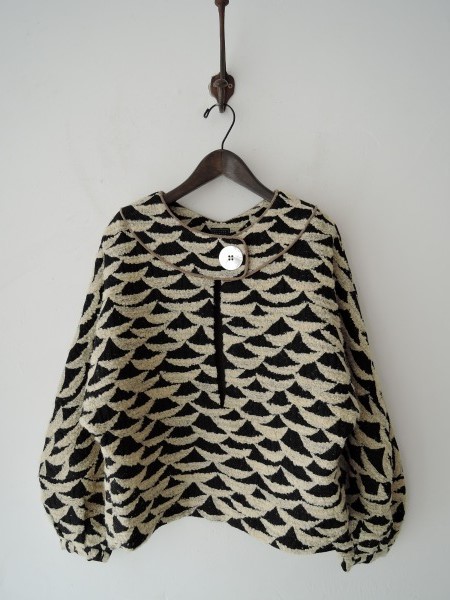 デザイン:mina perhonen 「ripples」のプルオーバーです。カラーはベージュ×黒の柄織です。ベージュ部分は少し毛羽感のある素材であしらわれており、フロント1つボタン&左サイド裾からジッパー開きです。裏地付きです。(掲載写真は、実商品のカラーにできるだけ近づけるよう努力はしておりますが、お使いのモニターや画面設定等によっては、色が異なって見える場合もございますので、予めご了承下さい)