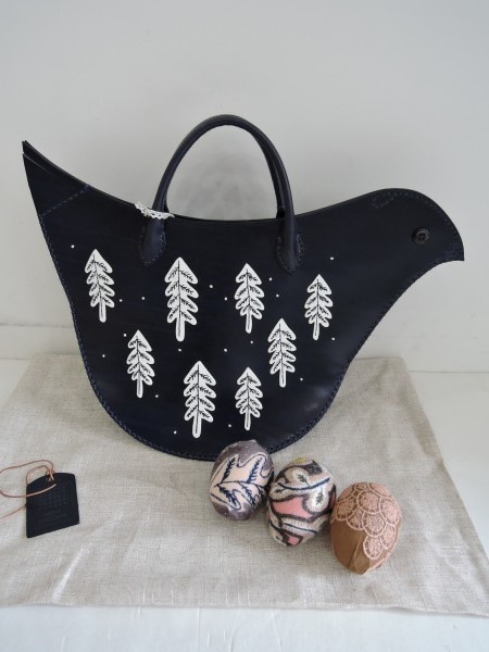 デザイン:mina perhonenのtori bag とりバッグです。カラーは濃紺のレザーで、フロントにはホワイトのレザーやビーズ等があしらわれたデザインです。3種類のテキスタイルが使用された3つの卵が付属されています。
