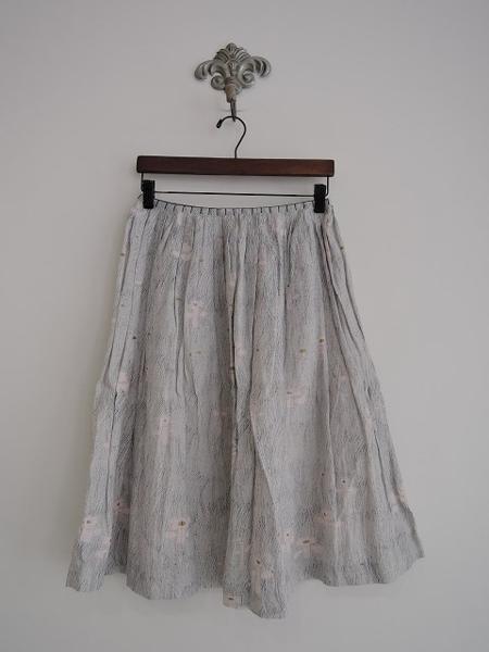 デザイン:mina perhonen 「day break」の総柄スカートです。カラーはライトグレー地に濃いグレー・薄ピンク・ゴールドの総柄で、薄手素材であしらわれ、ウエスト周りにタック&ネイビーのブランケットステッチが施されております。左ウエストのフック&ファスナーで着脱でき、裏地付きです。 (掲載写真は、実商品のカラーにできるだけ近づけるよう努力はしておりますが、お使いのモニターや画面設定等によっては、色が異なって見える場合もございますので、予めご了承下さい)