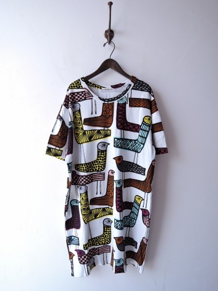 デザイン:mina perhonen 「mingling」の総柄ワンピースです。カラーはホワイト地にイエロー・ブラウン・グレー・ブラックなどの総柄プリントで、カットソー素材であしらわれております。プルオーバータイプです。 (掲載写真は、実商品のカラーにできるだけ近づけるよう努力はしておりますが、お使いのモニターや画面設定等によっては、色が異なって見える場合もございますので、予めご了承下さい)