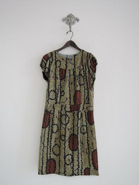 デザイン:mina perhonen 「garland」の総柄ワンピースです。カラーはグリーングレーベースにグリーン系カーキ・こげ茶・ブラックなどで、微起毛素材であしらわれております。バックネックのボタン&左脇下のファスナーで着脱でき、袖の上側にゴム入りで、裏地付きです。 (掲載写真は、実商品のカラーにできるだけ近づけるよう努力はしておりますが、お使いのモニターや画面設定等によっては、色が異なって見える場合もございますので、予めご了承下さい)