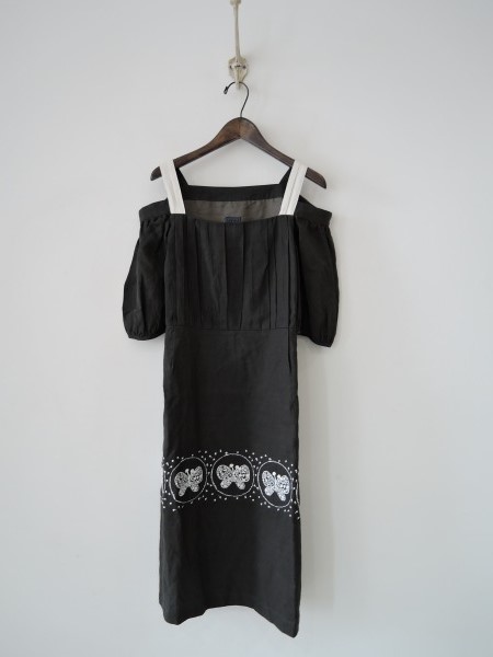 デザイン:mina perhonen 「forest wing」の麻ワンピースです。カラーは緑混じりのダークグレー×薄いベージュで、薄っすら透け感のある薄手の麻布帛に、刺繍があしらわれております。左脇のジッパー開きで、肩ヒモの調節はございません。オフショルダーのデザインで、袖口はボタン&ループ開きです。ポケットはなく、裏地付きです。 (掲載写真は、実商品のカラーにできるだけ近づけるよう努力はしておりますが、お使いのモニターや画面設定等によっては、色が異なって見える場合もございますので、予めご了承下さい)