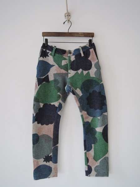 デザイン:mina perhonen 「flower basket」の毛麻ホップサックパンツです。カラーはグレー杢×紺×緑青×緑×灰水色×ピンクベージュなどです。少し毛羽立ったホップサックの生地です。フロントは、ボタン&ジッパー開きで、タックはなく、バックはヨーク付きです。前後両腰にポケットがございます。 (掲載写真は、実商品のカラーにできるだけ近づけるよう努力はしておりますが、お使いのモニターや画面設定等によっては、色が異なって見える場合もございますので、予めご了承下さい)
