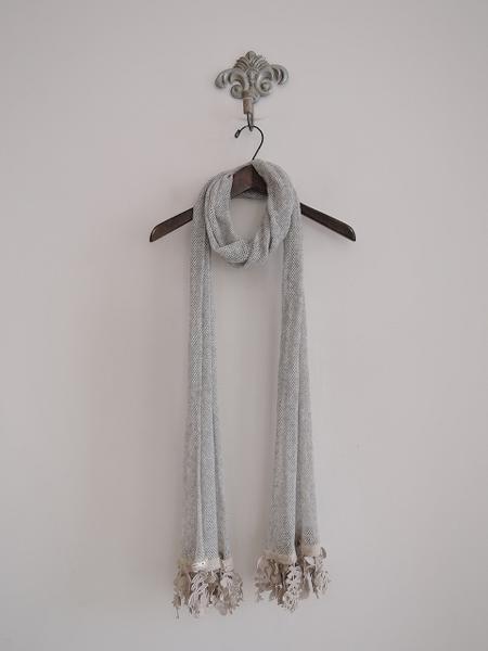 デザイン:mina perhonenのforest paradeシリーズのストールです。カラーはミックスグレーのメッシュ編みで施された透けのあるデザインで、両端にはベージュグレーの小鳥やお花等の繊細な刺繍モチーフがあしらわれています。