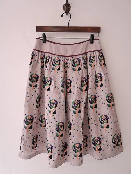 デザイン:mina perhonen 「sand rose」の刺繍スカートです。カラーは薄いパープルグレー地にパープル・グリーン・ブラック・サーモンオレンジの刺繍が施された薄手素材であしらわれております。腰周りにループパイピング&タック切り替えが施され、左ウエストのフック&ファスナーで着脱でき、裏地付きです。 (掲載写真は、実商品のカラーにできるだけ近づけるよう努力はしておりますが、お使いのモニターや画面設定等によっては、色が異なって見える場合もございますので、予めご了承下さい)