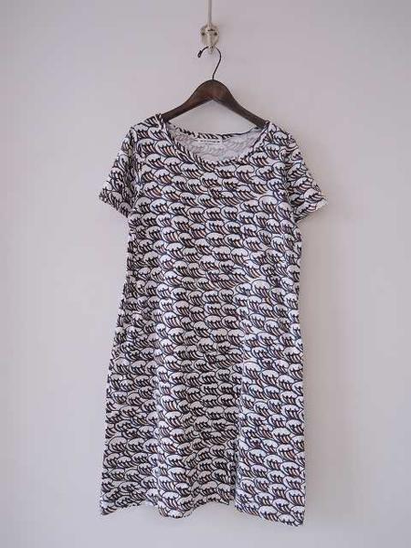 デザイン:mina perhonen 「nami」の総柄ワンピースです。カラーはホワイトベースにライトピンク×ブラウン×ネイビーのプリントで、カットソー素材であしらわれております。プルオーバータイプで、裏地は付いておりません。 (掲載写真は、実商品のカラーにできるだけ近づけるよう努力はしておりますが、お使いのモニターや画面設定等によっては、色が異なって見える場合もございますので、予めご了承下さい)