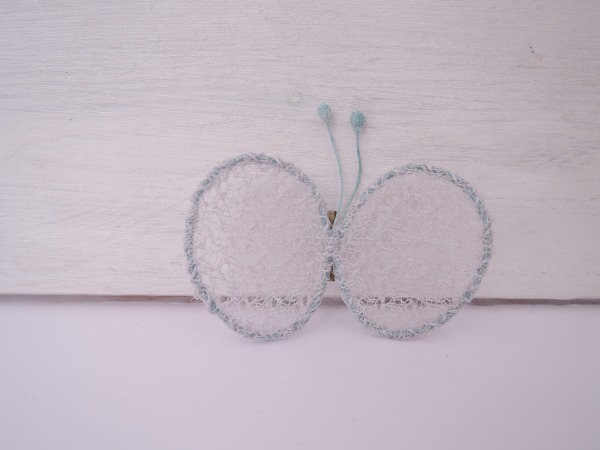 デザイン:mina perhonenのchouchoシリーズの蝶々ブローチです。カラーはライトグレーで、メッシュのような透けのあるニットがあしらわれたシンプルなデザインです。