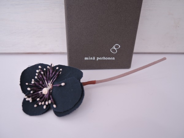 デザイン:mina perhonenのsonataシリーズのフラワーコサージュです。カラーはネイビーのお花にピンクベージュの茎があしらわれたシンプルなデザインです。