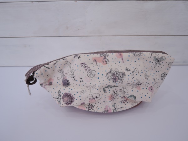 デザイン:mina perhonenのmemories of rainシリーズのポーチです。カラーは淡いライトベージュベースに、ピンク・グレー・ライトブルー等の手書き風の総柄で、底部がブラウンレザーの切り替えデザインです。ファスナー開閉で、内側はくすんだグリーンの裏地に、蝶々の刺繍があしらわれたポケットが1つ付いています。素材は表生地が綿100%、刺繍部分がキュプラ100%、裏生地が麻100%、別布部分が牛革です。