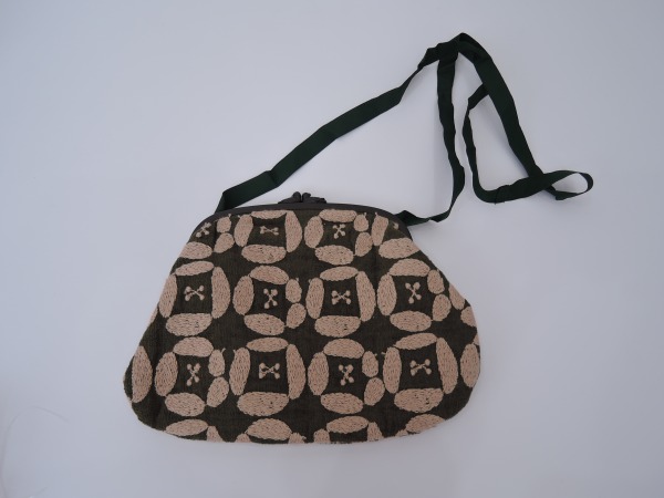 デザイン:mina perhonenのdearシリーズのカドルバッグです。カラーはくすんだグリーン地に、ベージュでお花の刺繍が施されたデザインで、持ち手はダークグリーンのリボンであしらわれています。開口部は鳥のモチーフ付きのがま口仕様で、内側はライトベージュの裏地に、ポケットが1つ付いております。素材は表生地が麻80%、綿20% 刺繍部分が綿100% 裏生地が麻53%、絹47%です。