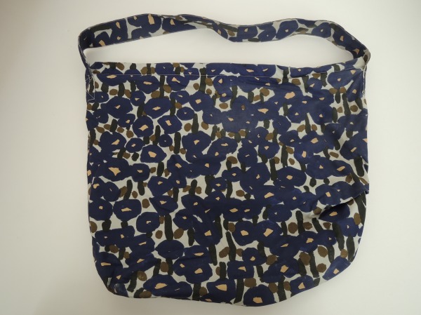 デザイン:mina perhonenのsonataシリーズのボディバッグ大です。カラーはライトグレー地にネイビー・ブラウン・ベージュ等のお花が全面に描かれたデザインで、開口部はファスナーです。内側にはグレーの裏地とポケットが1つ付いており、素材は表生地がポリエステル54%、綿46%、裏生地が綿100%です。
