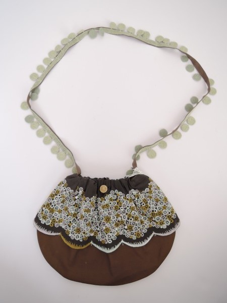 デザイン:mina perhonen 「skyful」のポシェットです。ベースカラーはブラウン系で、ライトピンク・うぐいす・サックス・ホワイト等のカットワークと刺繍が施された生地であしらわれたお子様用デザインです。開口部はゴム入りのループボタン留めで、ハンドルにはくすんだライトグリーンの刺繍モチーフが施されております。