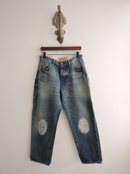 デザイン:mina perhonen 「always」のデニムパンツです。カラーはインディゴブルーで、ユーズド&ダメージ加工が施されております。ボタンフライで、5ポケット付き、両膝にオフホワイトのフロッキープリントが施されております。ウエスト裏側とポケット内袋は「mermaid」の刺繍柄になっております。定価37,000円の商品です。 (掲載写真は、実商品のカラーにできるだけ近づけるよう努力はしておりますが、お使いのモニターや画面設定等によっては、色が異なって見える場合もございますので、予めご了承下さい)