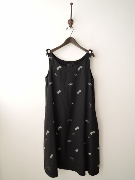 デザイン:mina perhonen 「choucho」のノースリワンピースです。カラーは少し光沢のある褪せたブラック×白の刺繍で、地模様の入った薄手の生地です。両肩のボタン留めで、Aラインのシルエットです。裏地付きで、両サイドにシームポケットがございます。 (掲載写真は、実商品のカラーにできるだけ近づけるよう努力はしておりますが、お使いのモニターや画面設定等によっては、色が異なって見える場合もございますので、予めご了承下さい)