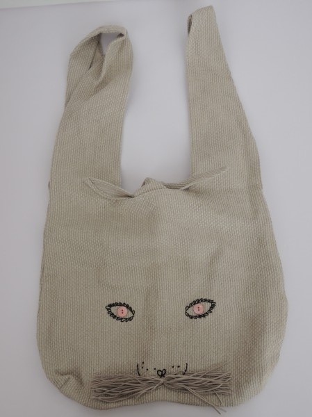 デザイン:mina perhonenのusa bag うさバッグ大です。カラーはベージュで、フロントにはブラックの刺繍・ピンクのボタン・ベージュグレーの紐でうさぎさんのお顔がデザインされており、持ち手は耳の様にあしらわれています。内側にはポケットが1つ付いており、素材は表生地が麻100%です。