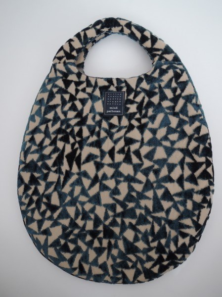 デザイン:mina perhonenのlitシリーズのエッグバッグです。カラーは薄ブラウンベージュ地に光沢のあるくすんだネイビーのパイル刺繍が施されたデザインで、パイピングはブラックの合皮です。内側には光沢のあるグレーの裏地が付いており、素材は表生地が毛100%、パイルがアクリル100%、裏生地がポリエステル100%です。