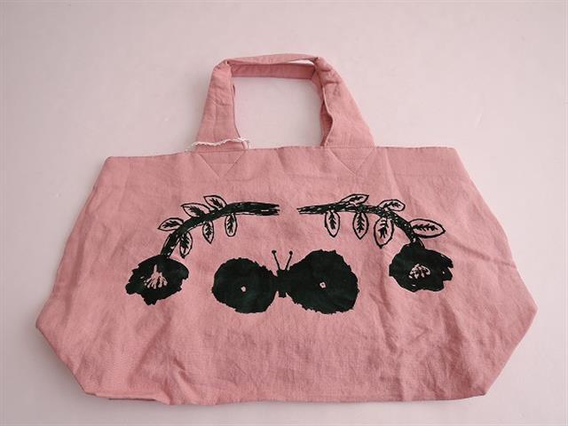 デザイン:mina perhonen×TOKYO SKYTREEのfly & bloom パニーニバッグです。カラーはピンクで、麻の織り地であしらわれており、グリーンのフロッキープリントが施されたデザインです。開口部はひもが通った巾着タイプで、内側にオープンポケットが1つございます。素材は麻100%です。